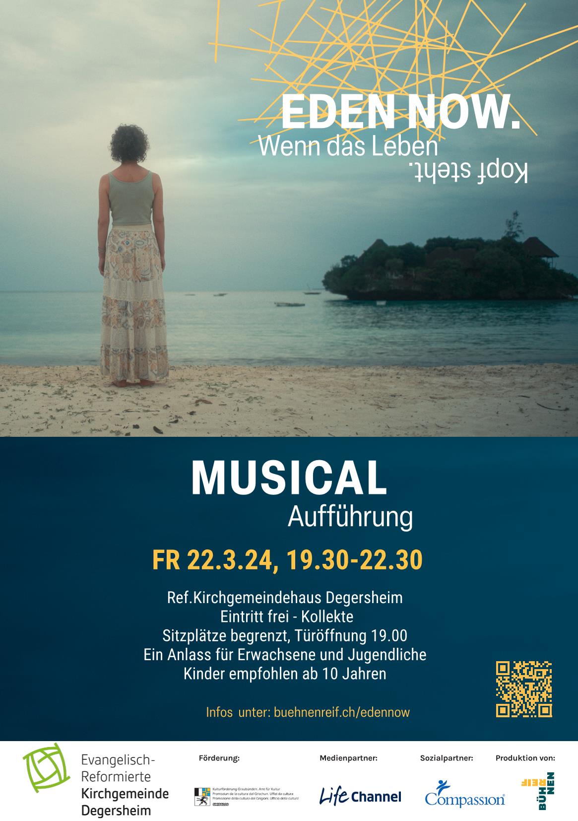 EDEN NOW wird geprägt von der Sinfonie der Weisheit. Komponiert und produziert von Patric Scott. Sonst finden sich im Stück viele bekannte Songs, unter anderen von John Miles, Sara Bareilles, Michael Patrick Kelly, Baschi und Mercy me.