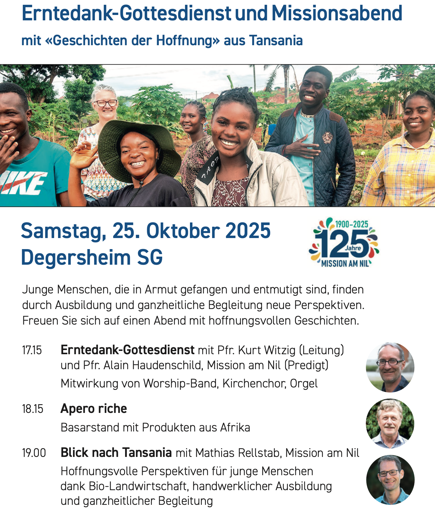 Zu diesem Gottesdienst heissen wir auch die Ostschweizer Freunde der Mission am Nil willkommen zu ihrem Missionstag.