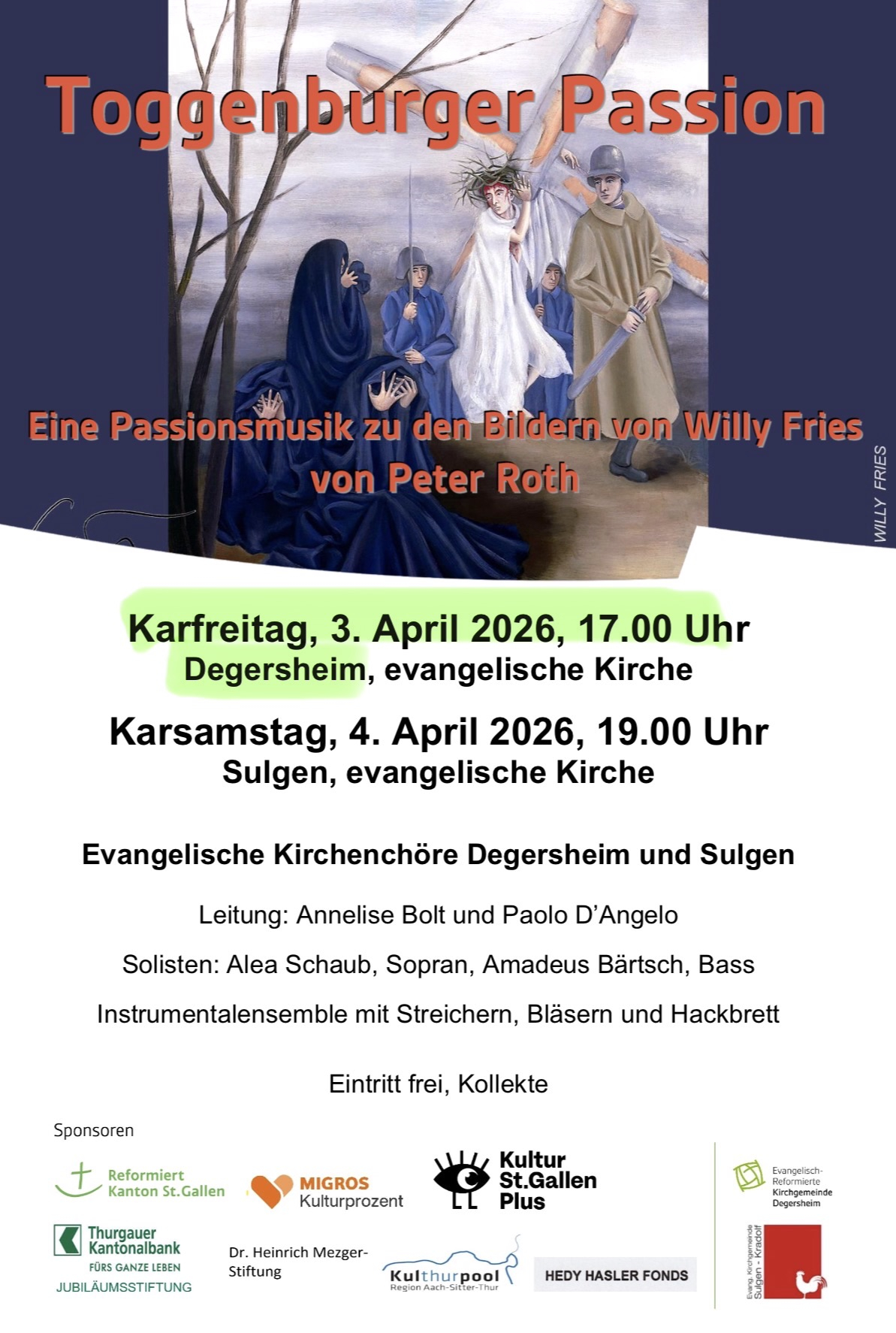 Angelehnt an die Ereignisse des Zweiten Weltkrieges hat der bekannte Wattwiler Maler Willy Fries einen Bilderzyklus «Die grosse Passion» erschaffen; dazu hat später der bekannte Toggenburger Komponist Peter Roth die Musik geschrieben. Die beiden Kirchenchöre Degersheim und Sulgen, zwei Solisten und ein Instrumentenensemble mit Streichern, Bläsern und Hackbrett führen zusammen dieses Werk auf.